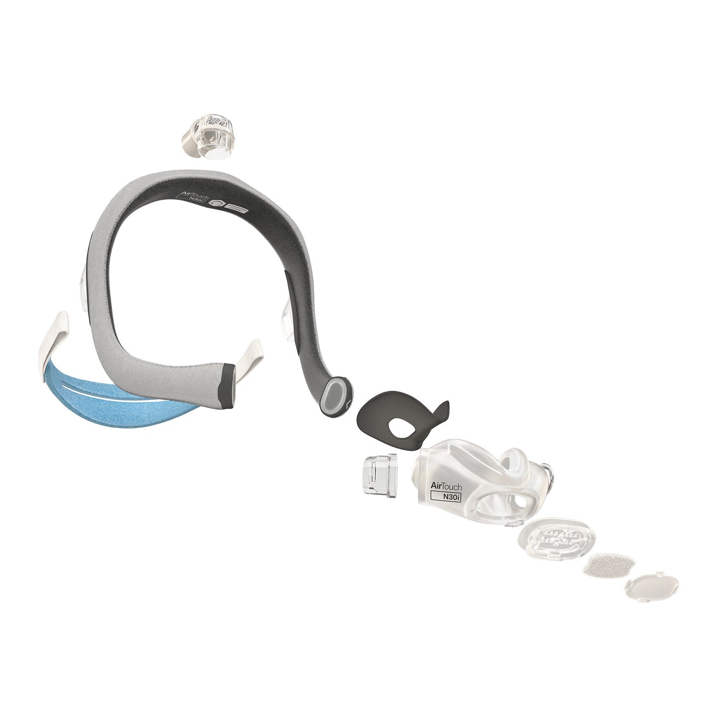 The AirTouch N30i shares all of the same design features as the AirFit N30i. The major difference is that the AirTouch N30i offers a unique cushion featuring a cloth seal, plus the hollow frame headgear is covered in a soft-touch, moisture wicking material.