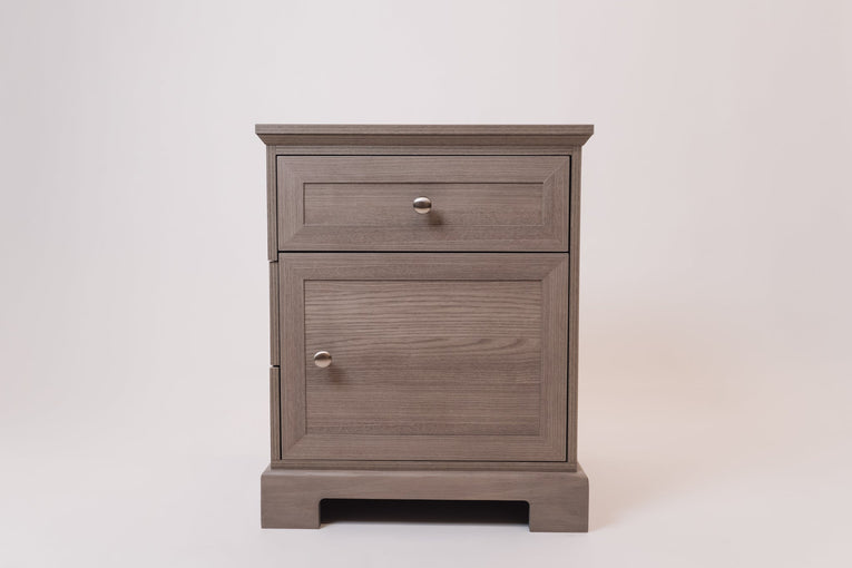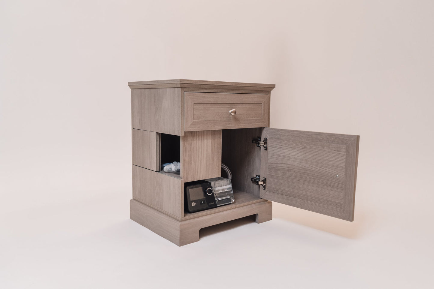 A CPAP nightstand in Charleston Gray finish, featuring a classic wooden panel design with a top drawer and a lower storage compartment, both equipped with round metal knobs. The nightstand has a sturdy base with a cutout detail for added style.