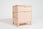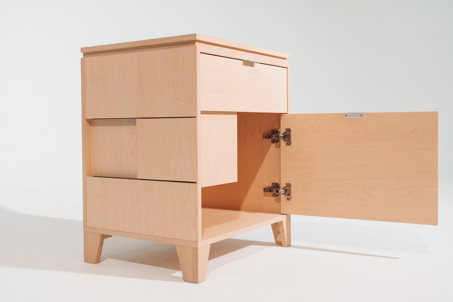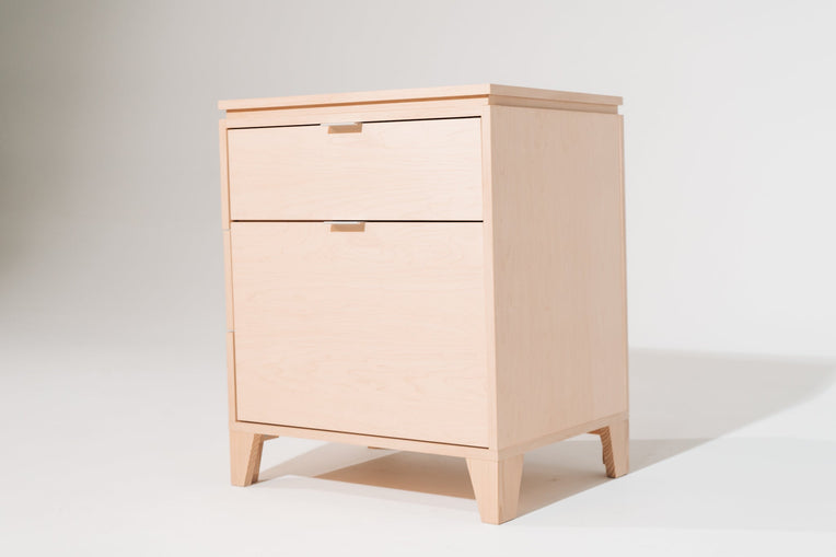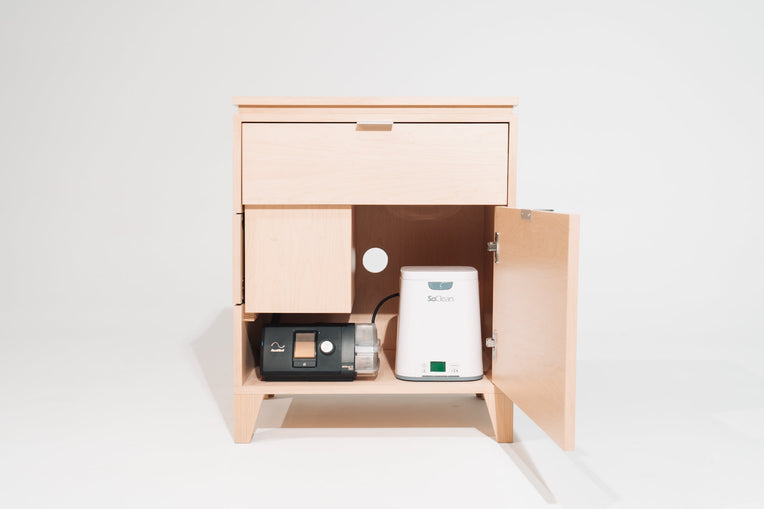 A modern CPAP nightstand made of Soho Maple wood, featuring two drawers with sleek metal handles and side cutouts for easy access to storage. The nightstand has a minimalist design with slightly tapered legs, providing a contemporary and functional aesthetic.