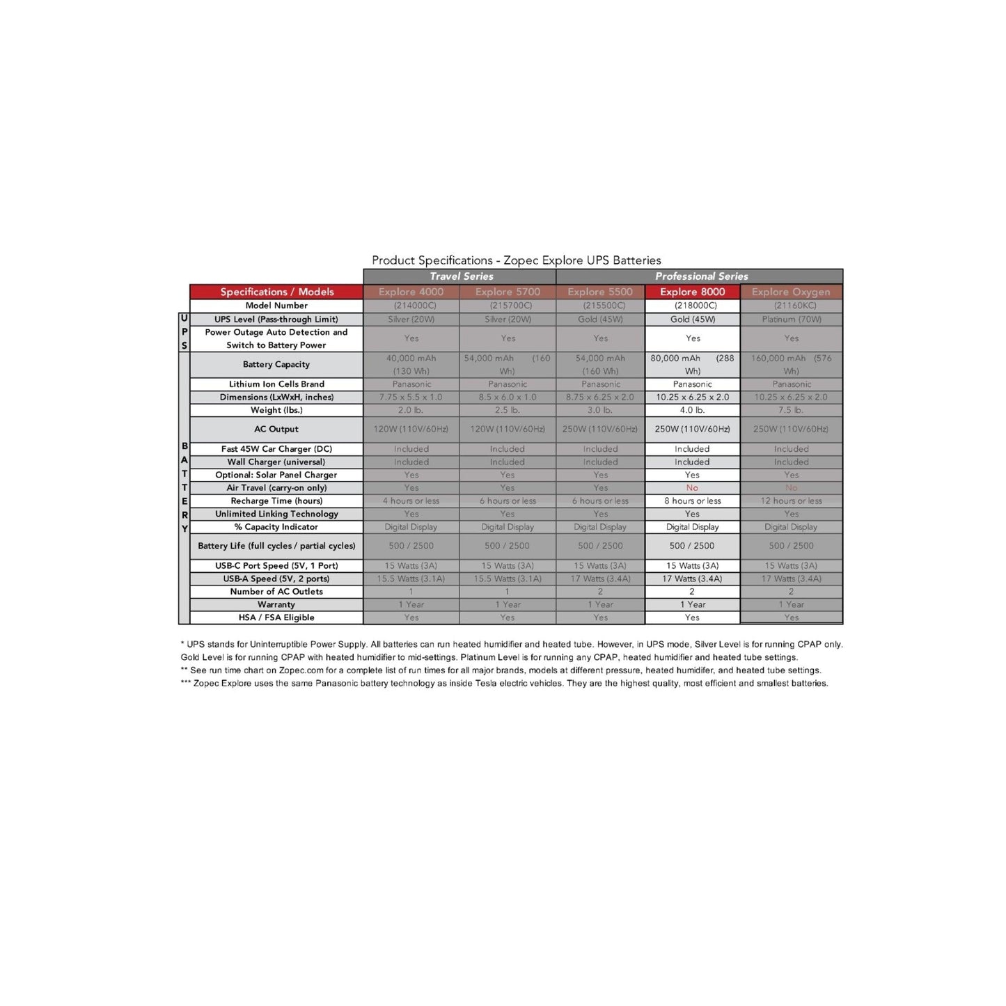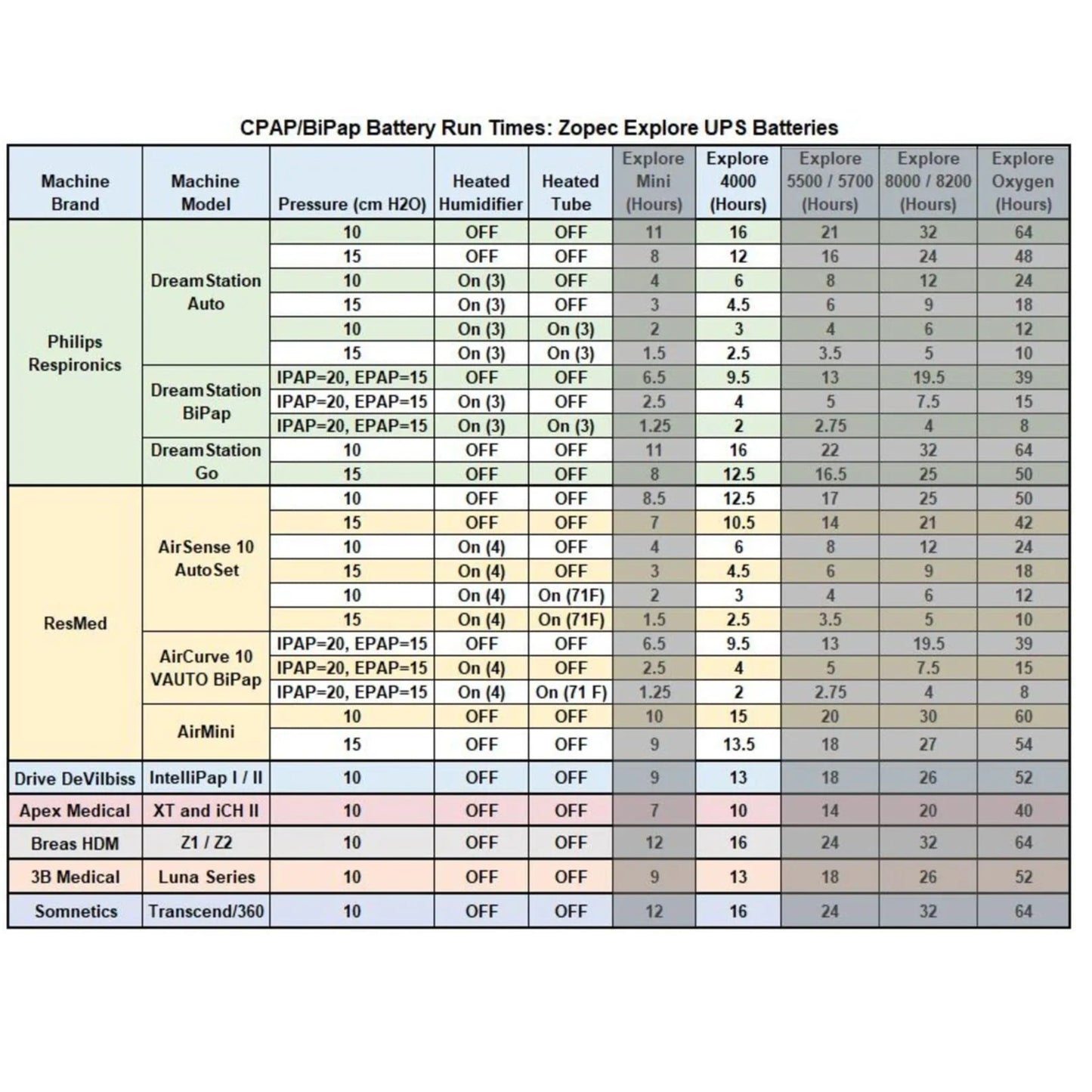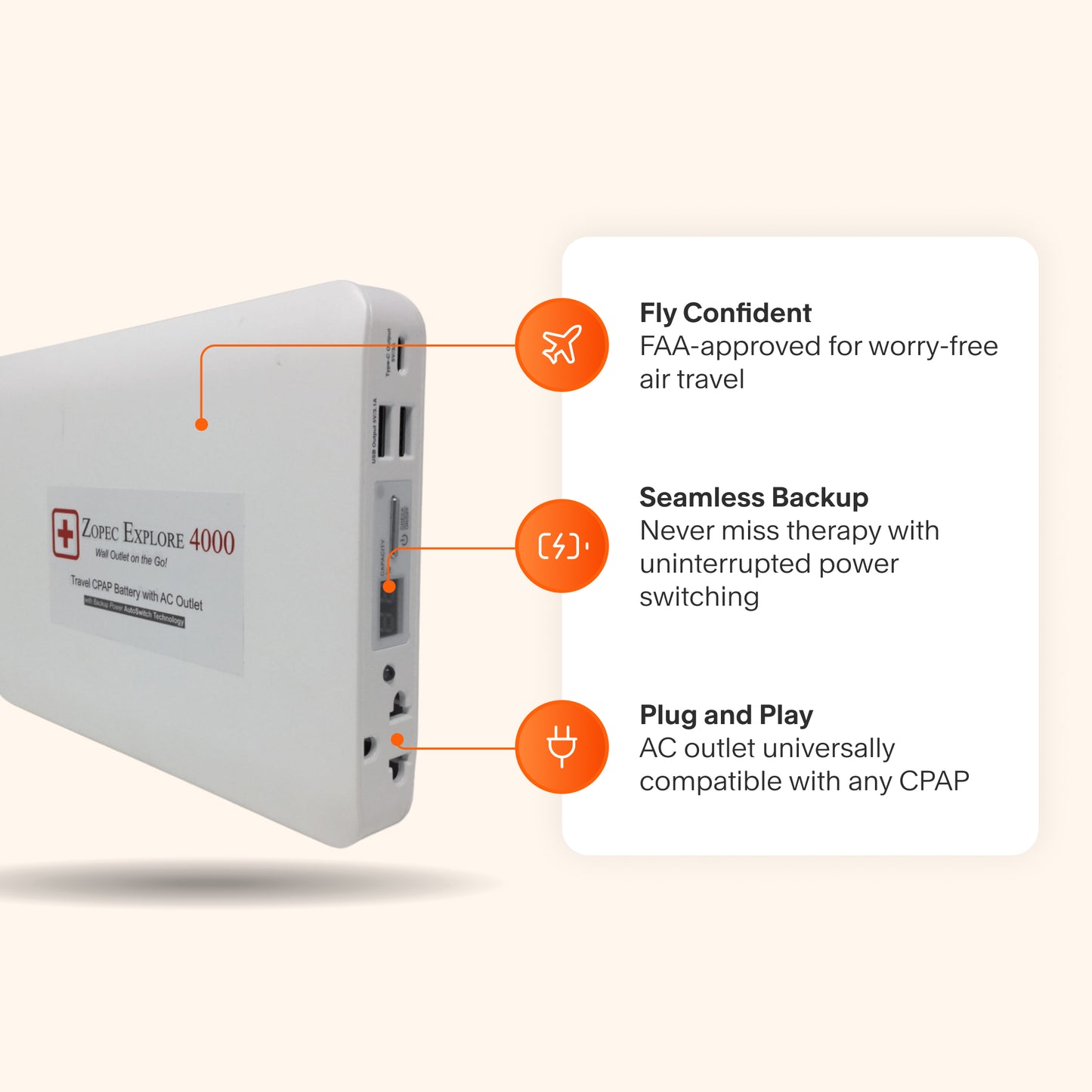 Sleep shouldn’t depend on the nearest outlet. The Zopec Explore battery family brings true online UPS protection to CPAP with models sized for everything from red-eye flights to multi-day outages. Plug in 24/7 and if utility power drops, AutoSwitch keeps therapy running without a blip. Pick your capacity by how you use comfort features: Silver level for CPAP-only, Gold for humidifier use, and Platinum for humidifier + heated tube.