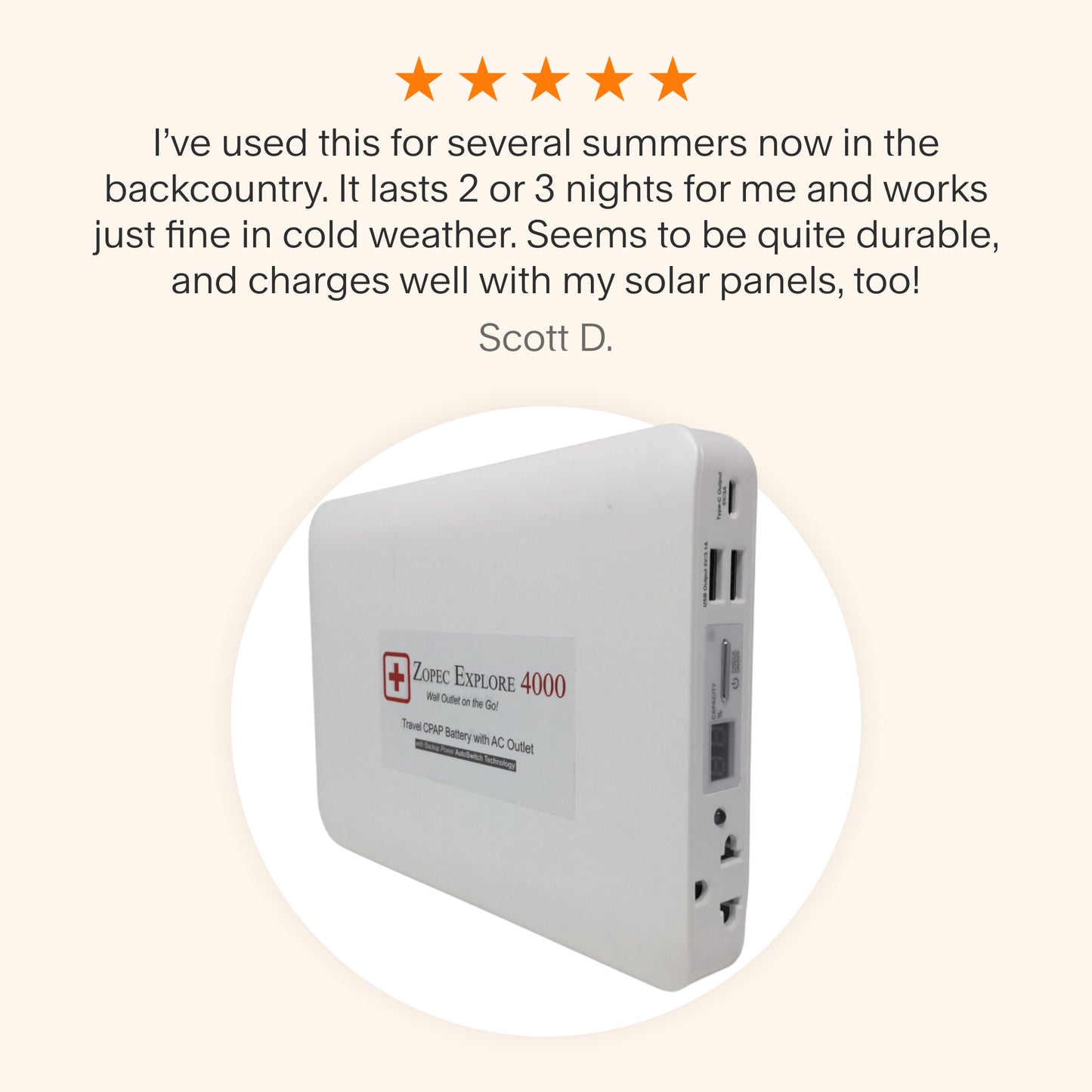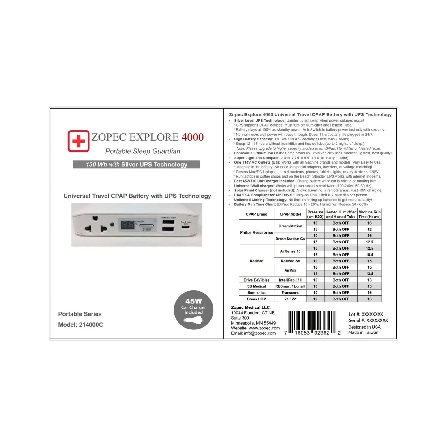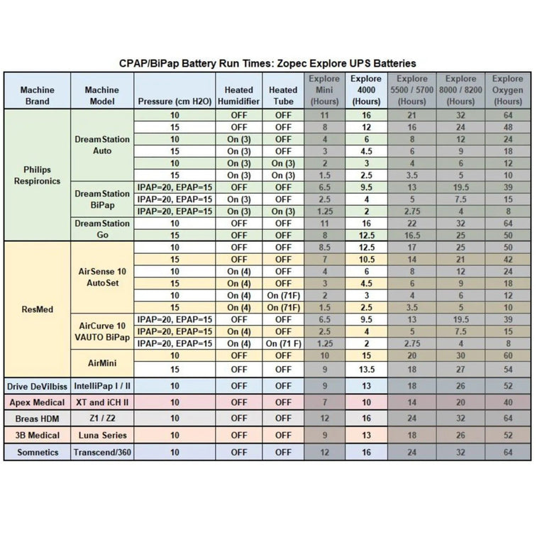 Sleep shouldn’t depend on the nearest outlet. The Zopec Explore battery family brings true online UPS protection to CPAP with models sized for everything from red-eye flights to multi-day outages. Plug in 24/7 and if utility power drops, AutoSwitch keeps therapy running without a blip. Pick your capacity by how you use comfort features: Silver level for CPAP-only, Gold for humidifier use, and Platinum for humidifier + heated tube.